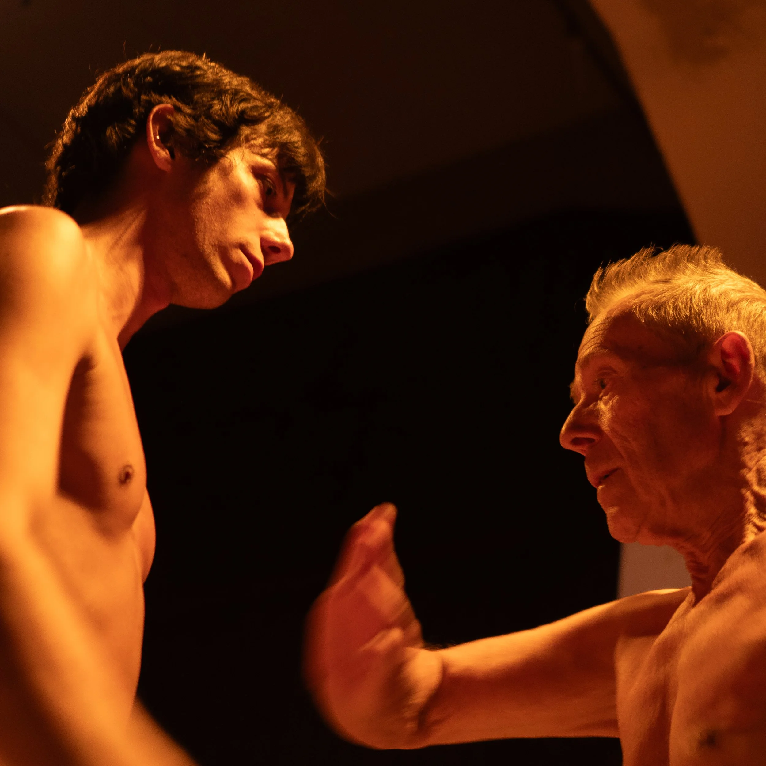 As part of the evening, Sascha Paar and Karl Reinisch developed the choreographic piece GRENZKÖRPER – a physically condensed encounter between two generations. The performance explores intimacy, vulnerability, and mutual perception as resonant spaces between a young and an old body. Everyday gestures – sitting, breathing, touching – become reflections on coexistence.